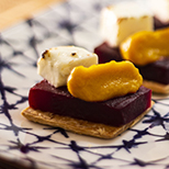 Arancini Betterave & Fromage de Chèvre Ricotta au Citron, Chips de Betterave, Purée de Betterave