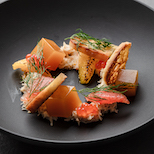 Crabe et Caviar Mousse à l’Orange & Aneth, Gelée au Gingembre & Agrumes, Segments d’Oranges & Pamplemousse, Croûton de Ciabatta au Beurre