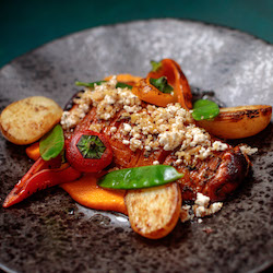Feta Cuite au Thym, Orange & Olive Pommes de Terre Nouvelles, Légumes Méditerranéens Rôtis & Salade de Basilic